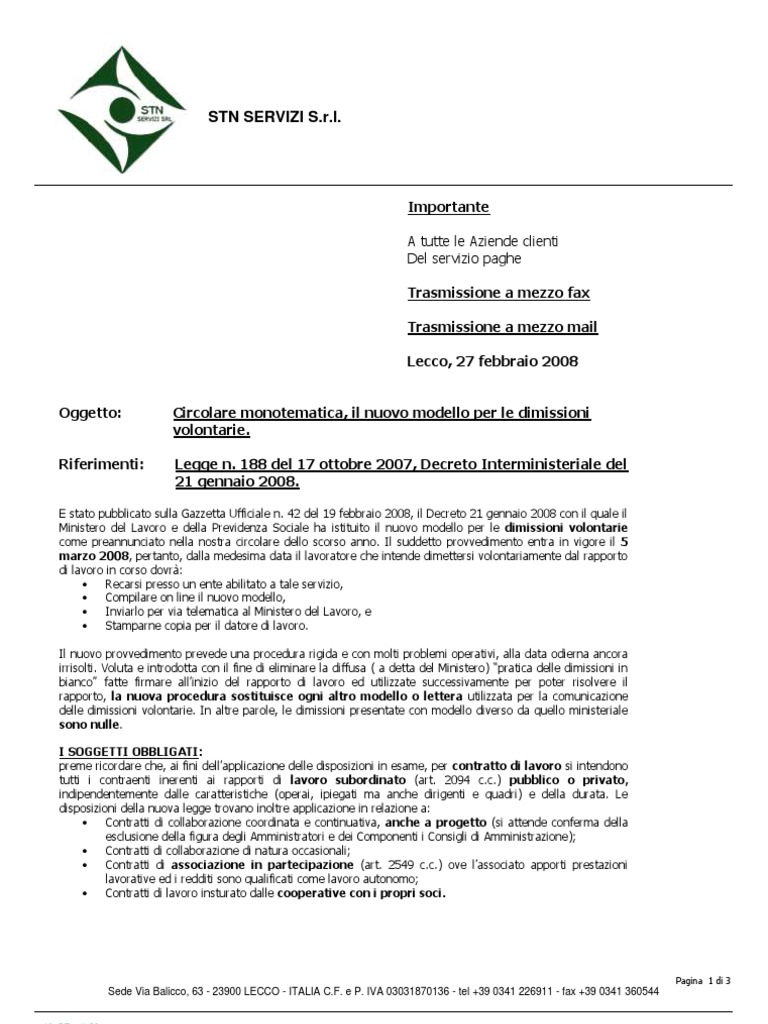 Lettera di Dimissioni - Modello, Fac-Simile Word e PDF La lettera di dimissioni è il mezzo con il quale il lavoratore comunica al datore di lavoro la sua intenzione di recedere dal rapporto di lavoro.. E' molto importante stabilire se la lettera di dimissioni è dovuta per giusta causa o per motivi personali. Nel primo caso, vi sono dei motivi giustificanti per un comportamento all'interno dell'azienda che giustificano le dimissioni del lavoratore.
